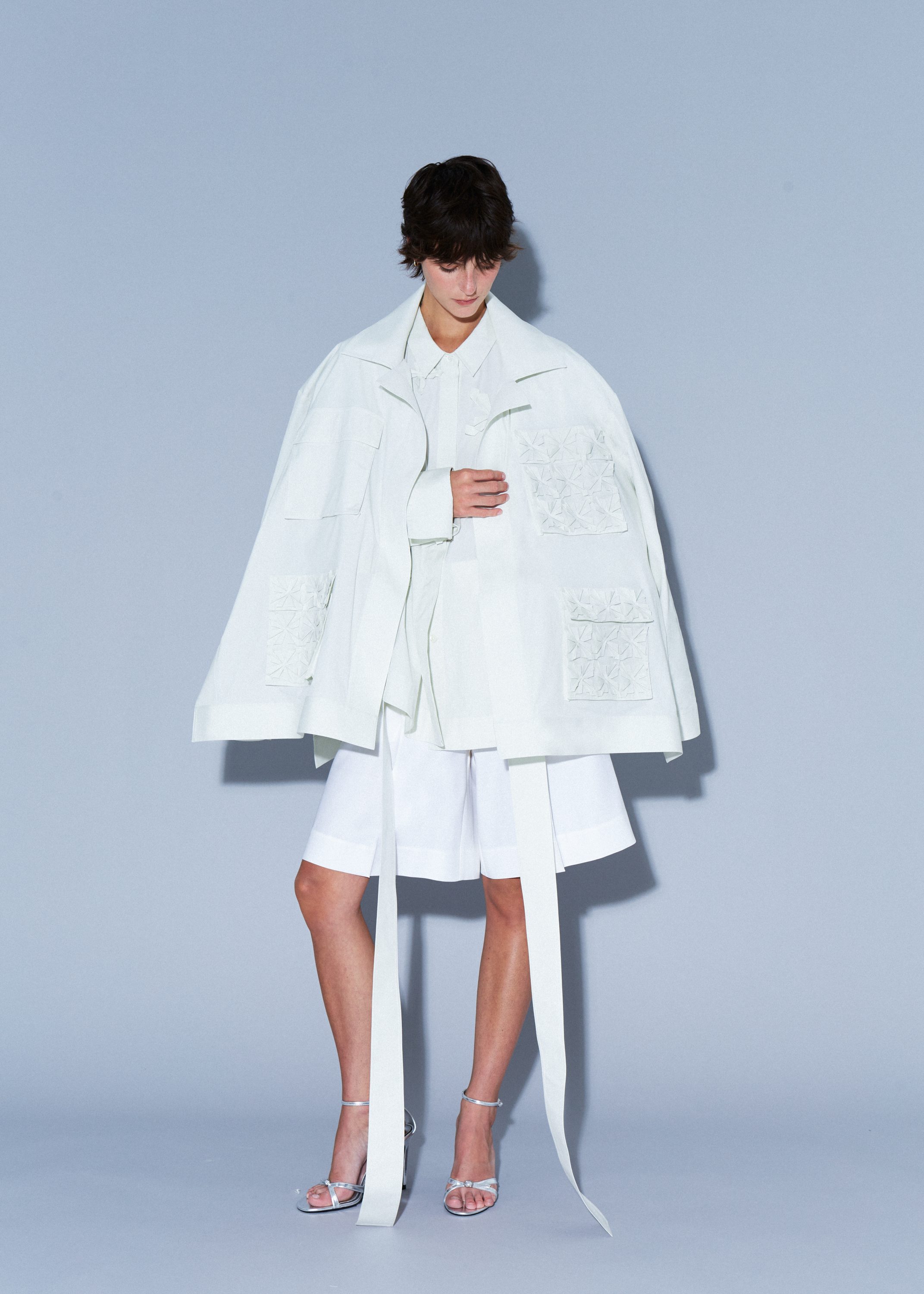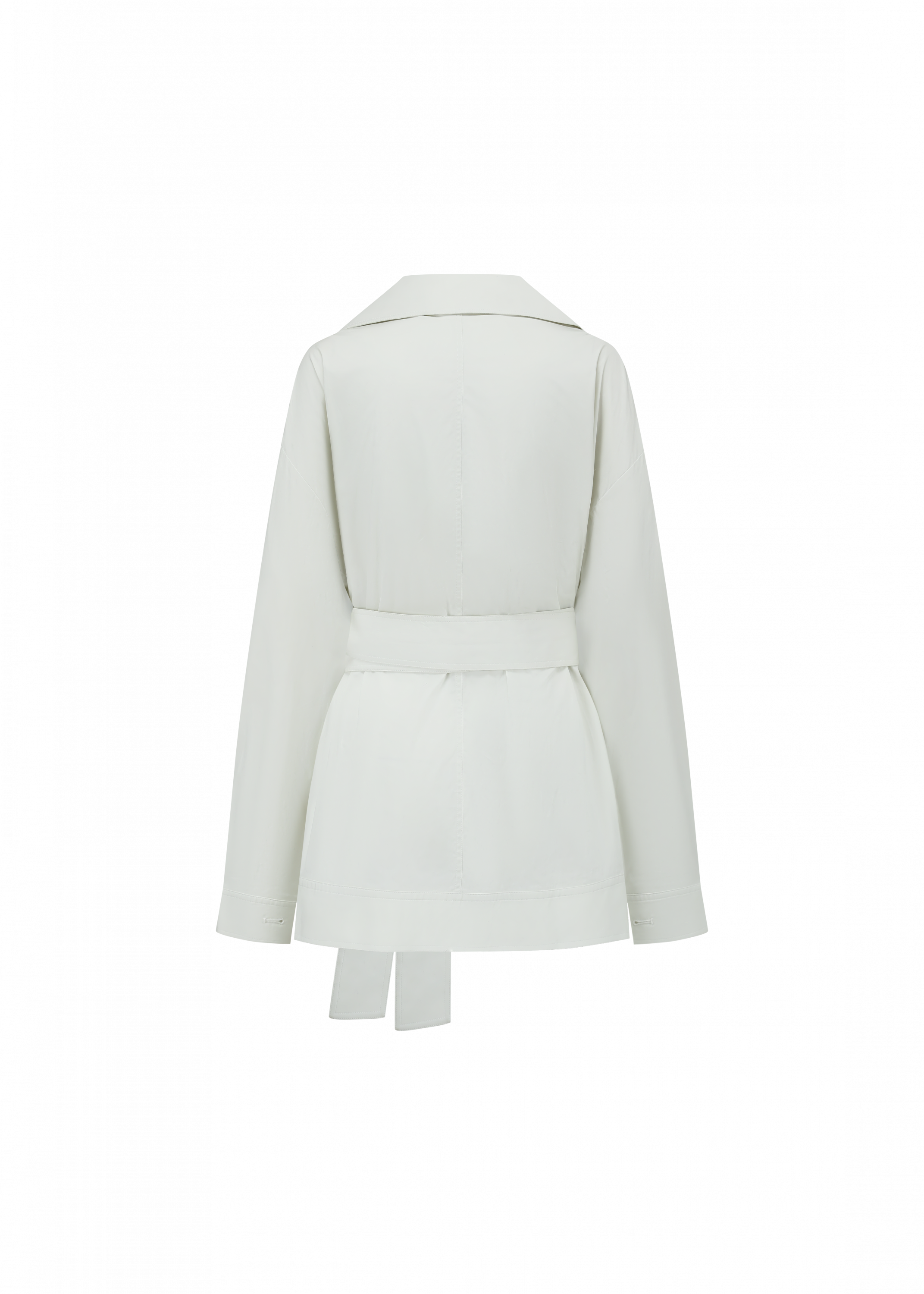 Cotton jacket-style top with a belted waist, accented by origami flower panels on the left front.