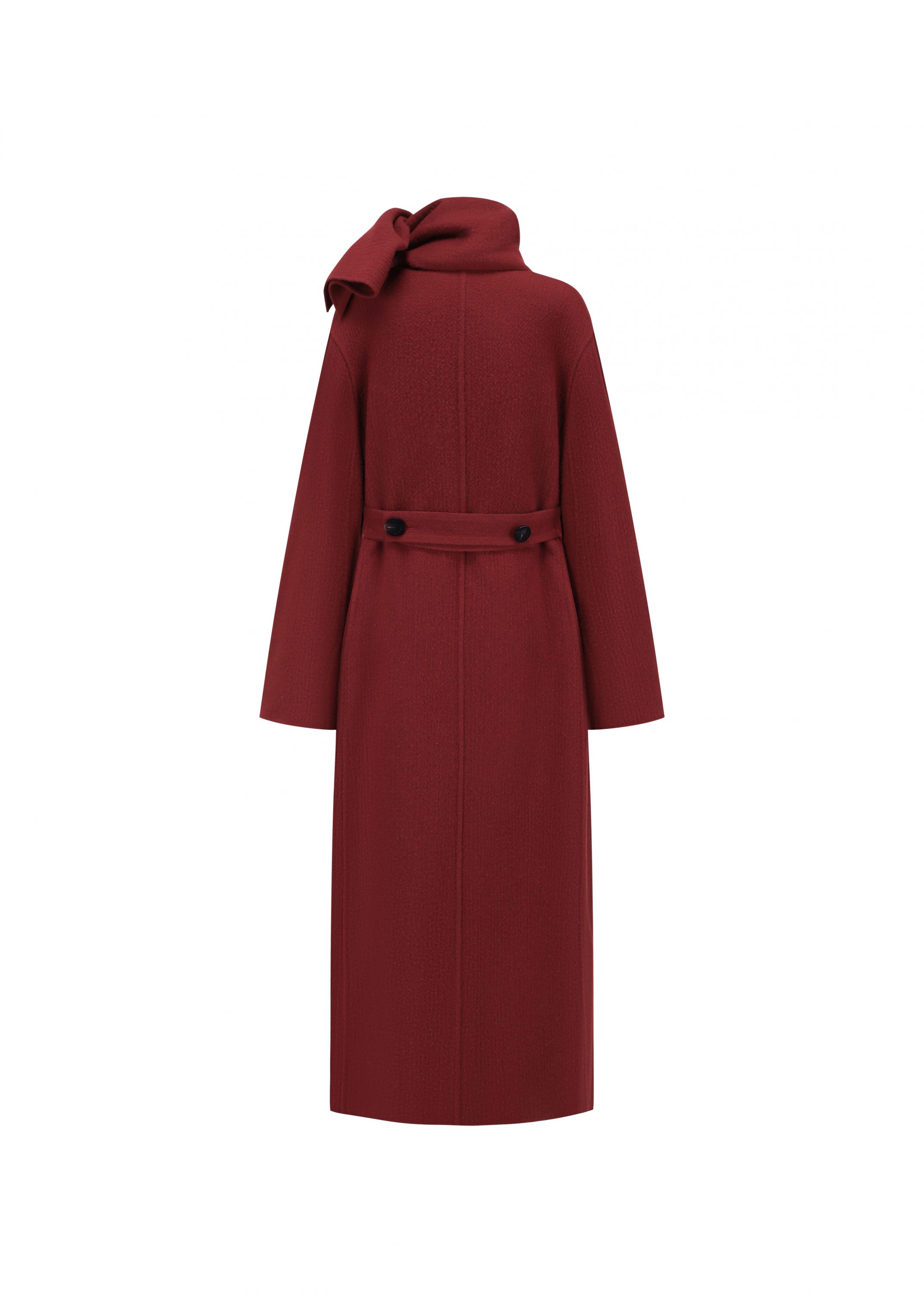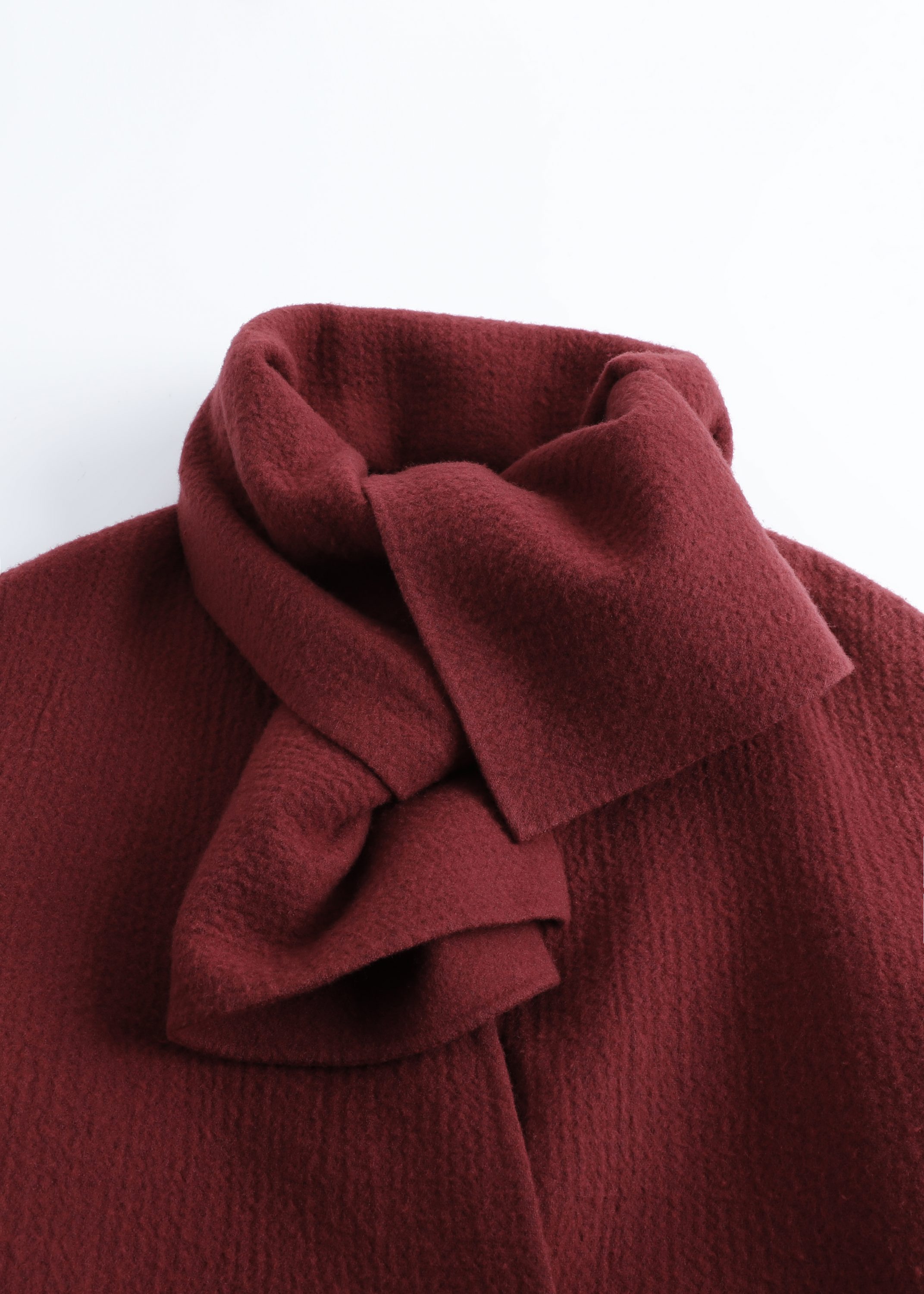 Crafted from exquisite Italian Ricceri cashmere, this long burgundy oversized coat allows a timeless sophistication with its voluminous sleeves and a clean neckline. A detachable scarf invites endless styling possibilities.