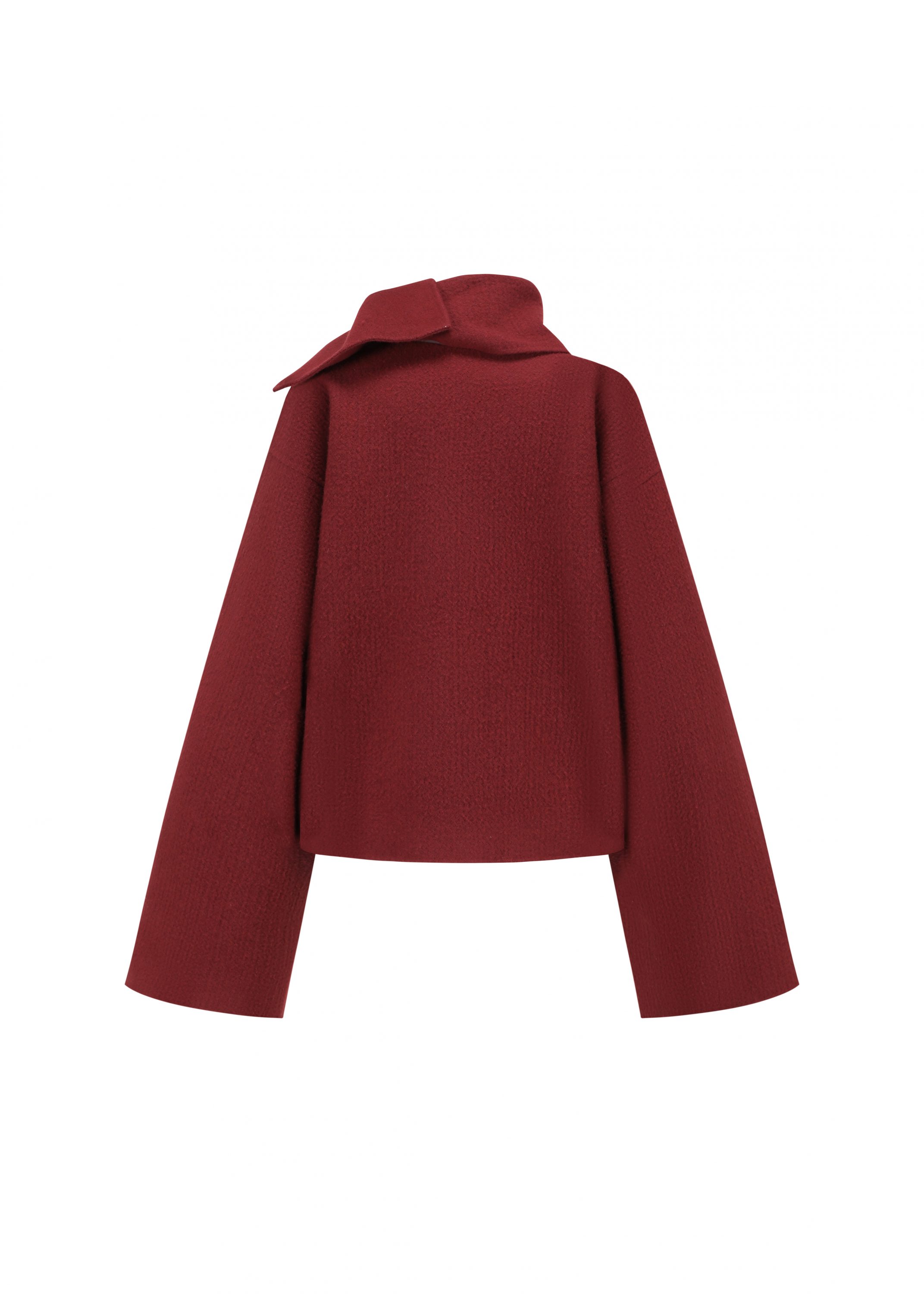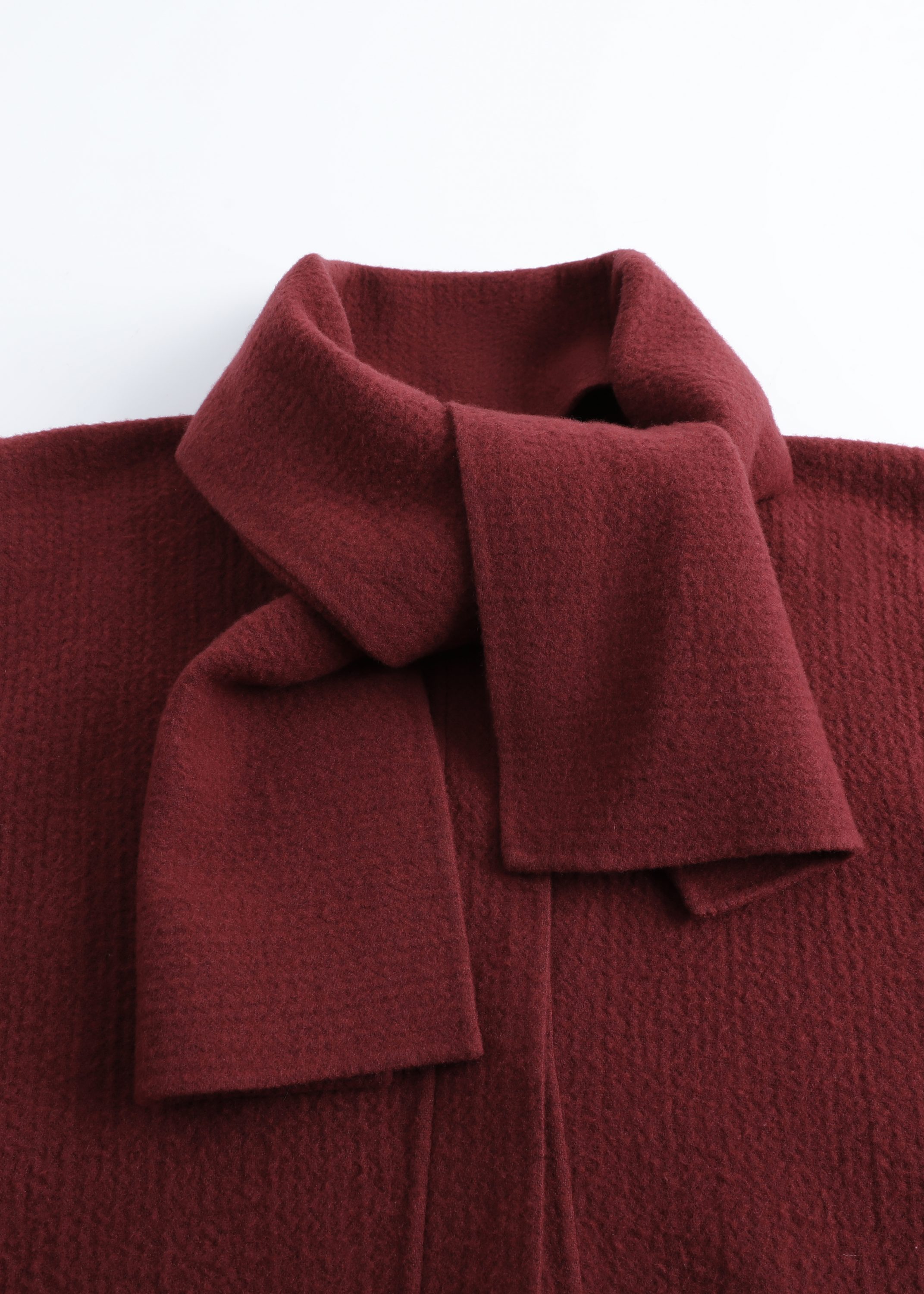 Crafted from exquisite Italian Ricceri cashmere, this burgundy jacket drapes in a relaxed and voluminous silhouette. A detachable scarf offers various styling.