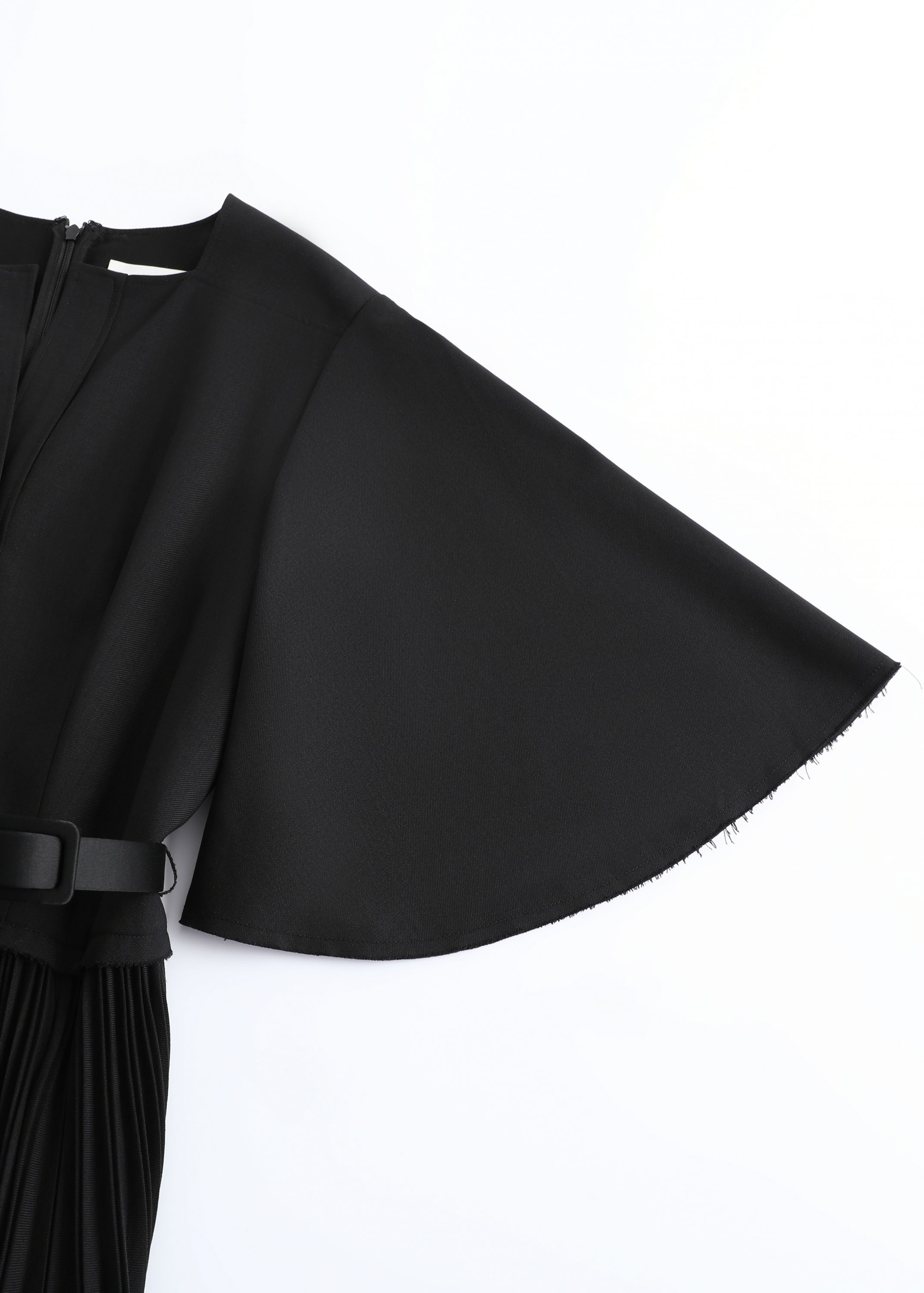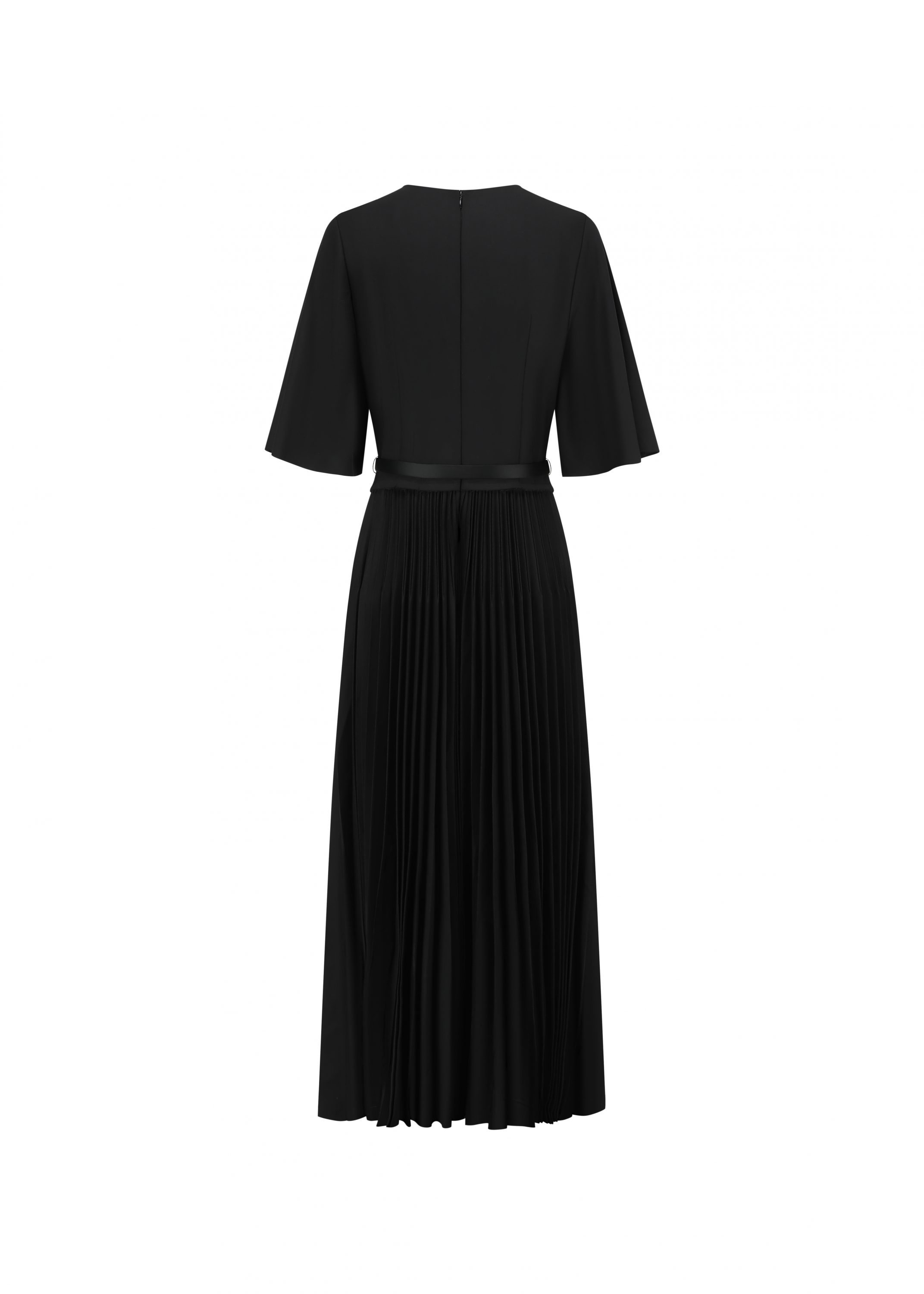 Tailored from fine wool, the dress features relaxed sleeves that that smartly refine the arm lines. Layered pleats fall along the hemline, lending the silhouette a sense of artful movement and fluidity.