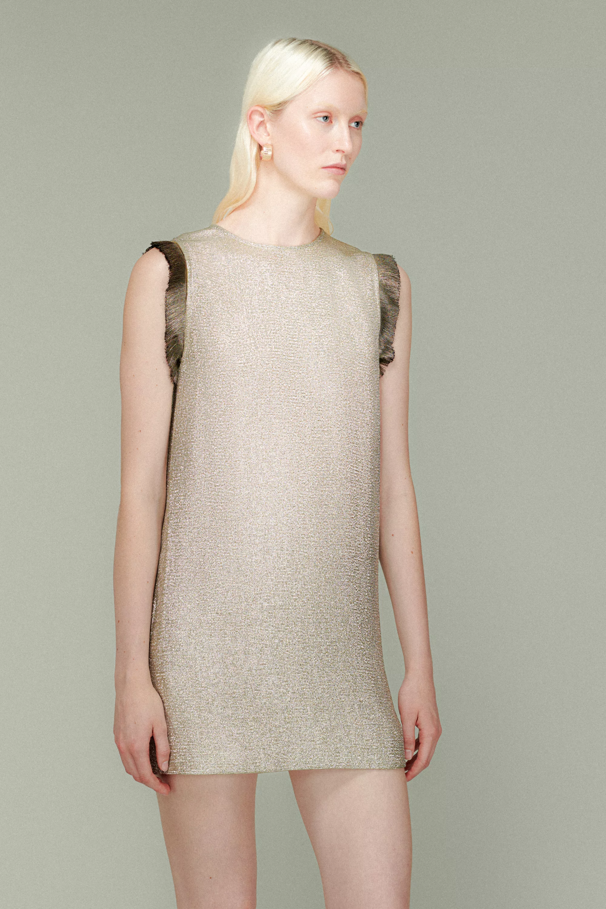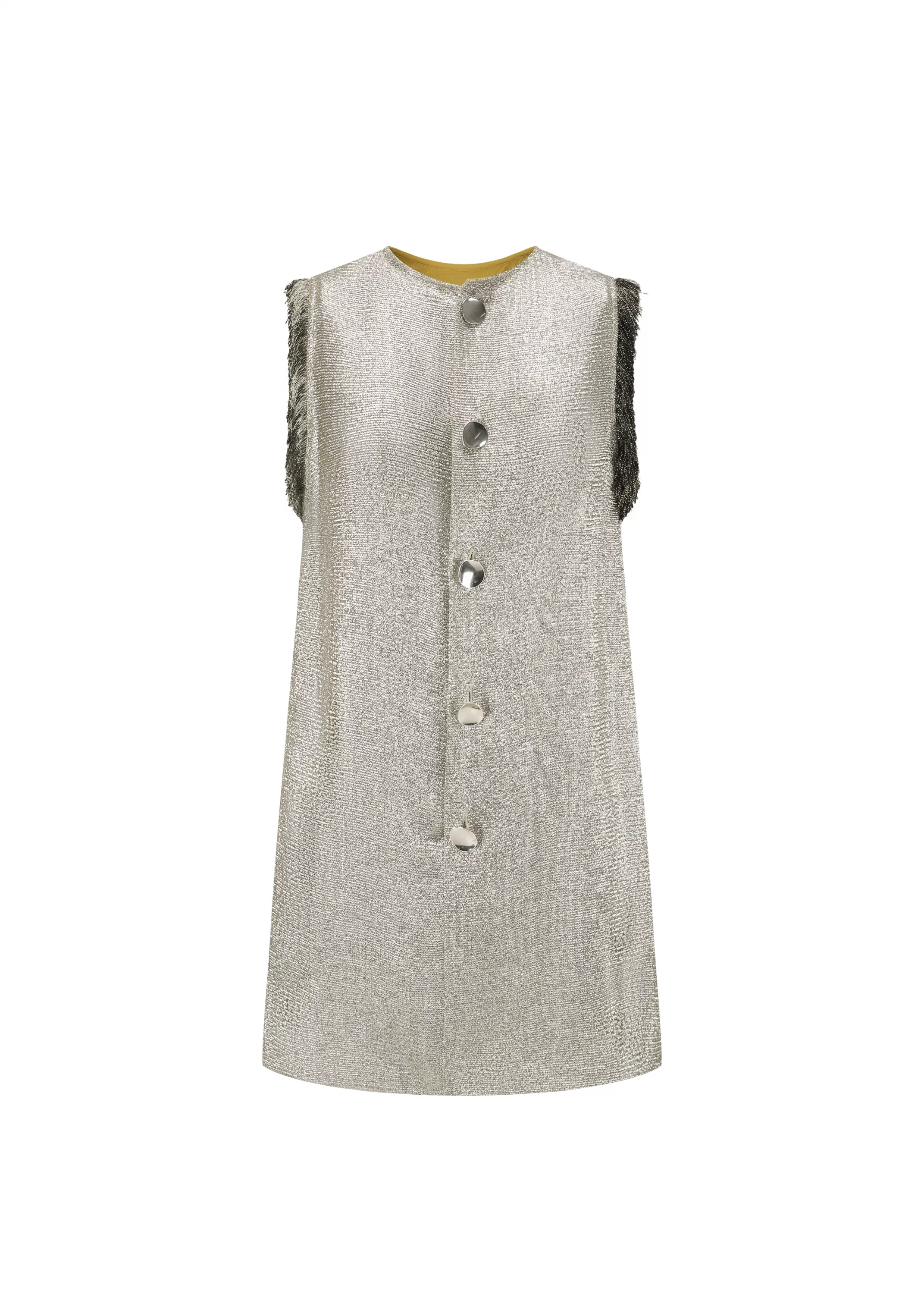 A luminous sleeveless mini dress adorned with delicate fringes. Designed to catch the light with every movement, it radiates effortless glamour.