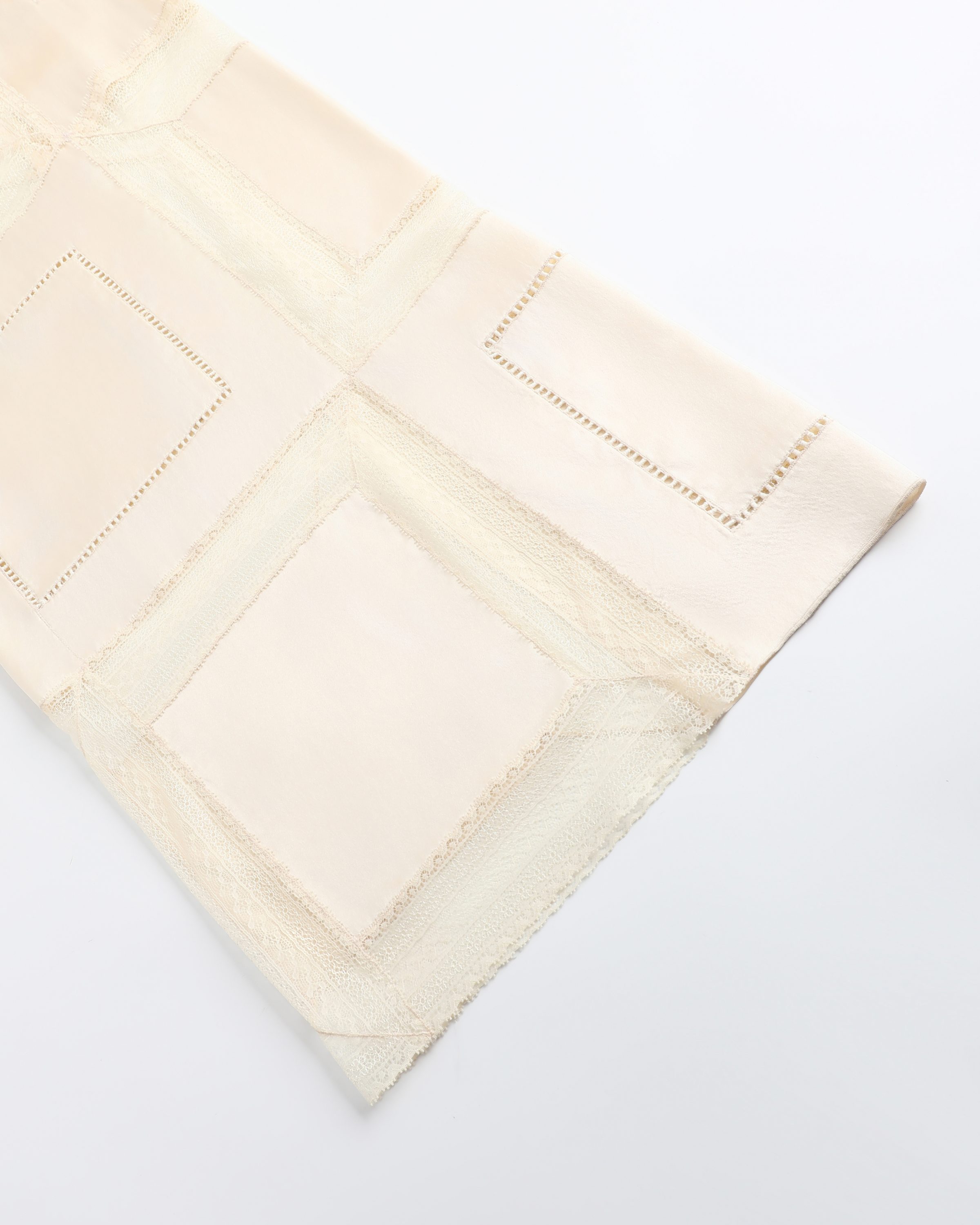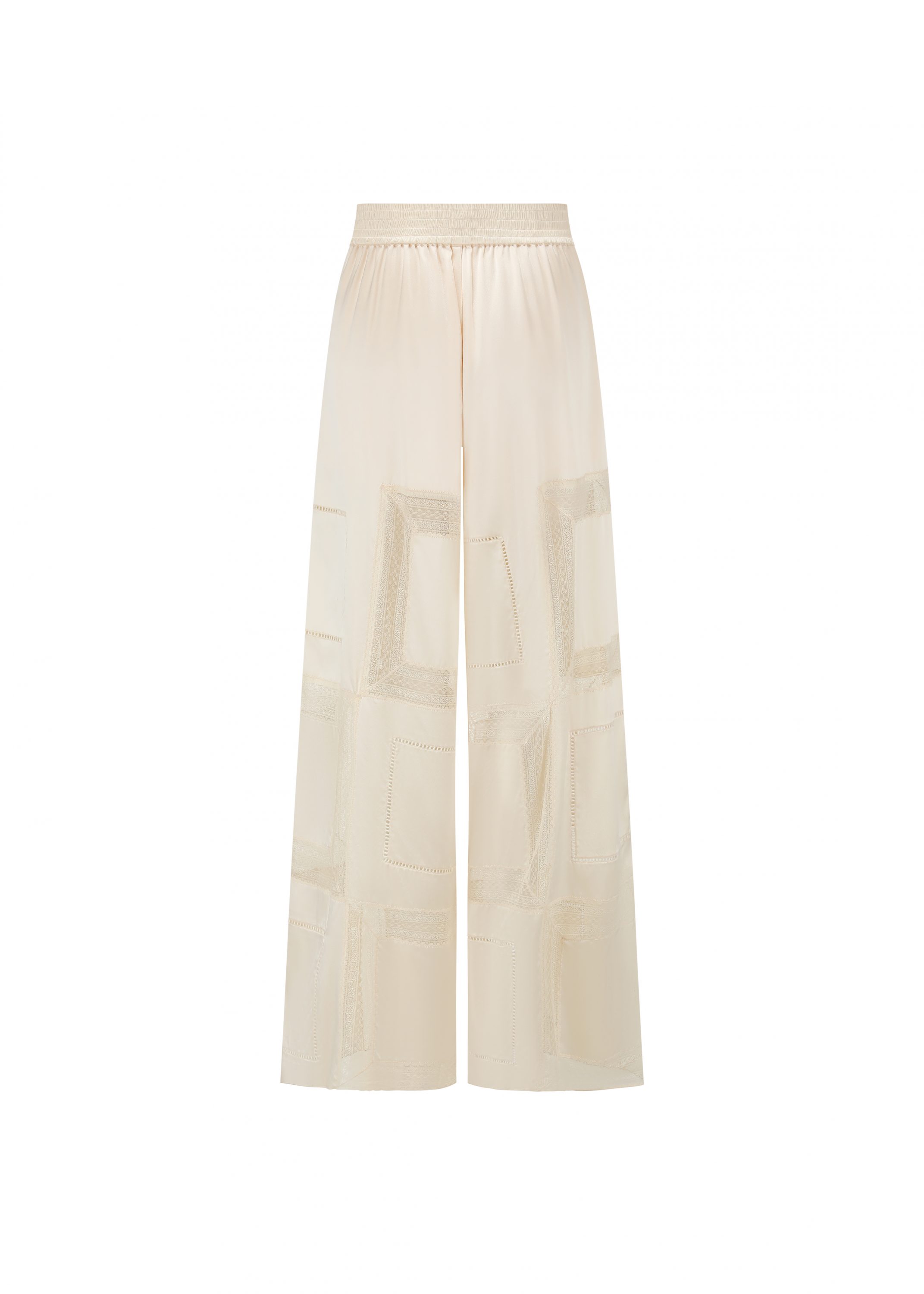 These pants are crafted through an intricate fusion of lace and silk, with every panel meticulously hand-assembled. The relaxed wide-leg cut flatters with ease and versatility and they can be paired with the matching top.