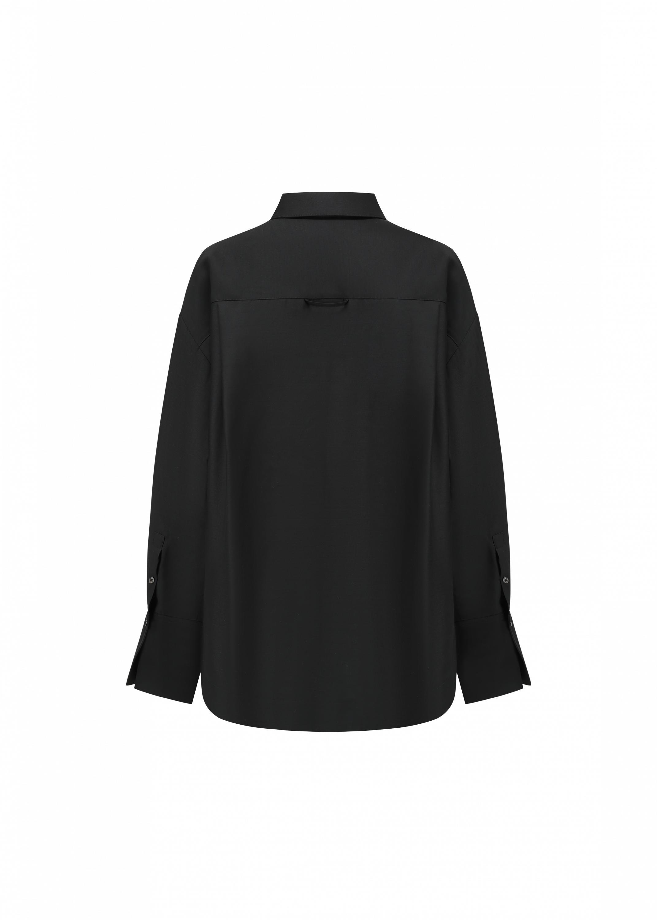 Silk-wool shirt with an asymmetrical chest—one side a sleek pocket, the other adorned with sculptural origami flowers.