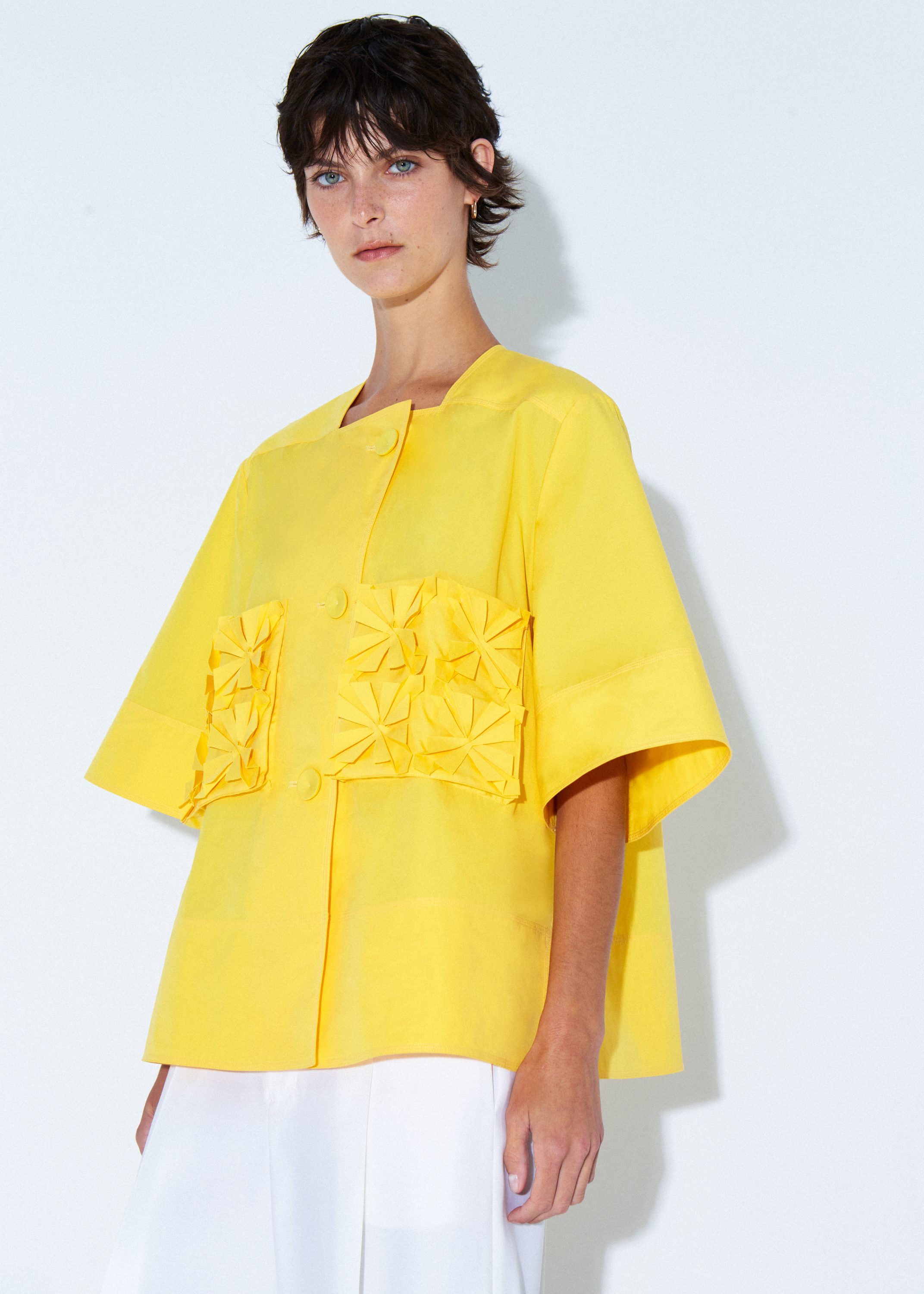 Cotton shirt with demi-length sleeves and a square neckline, featuring origami flower panels on both sides and three statement buttons at the front.
