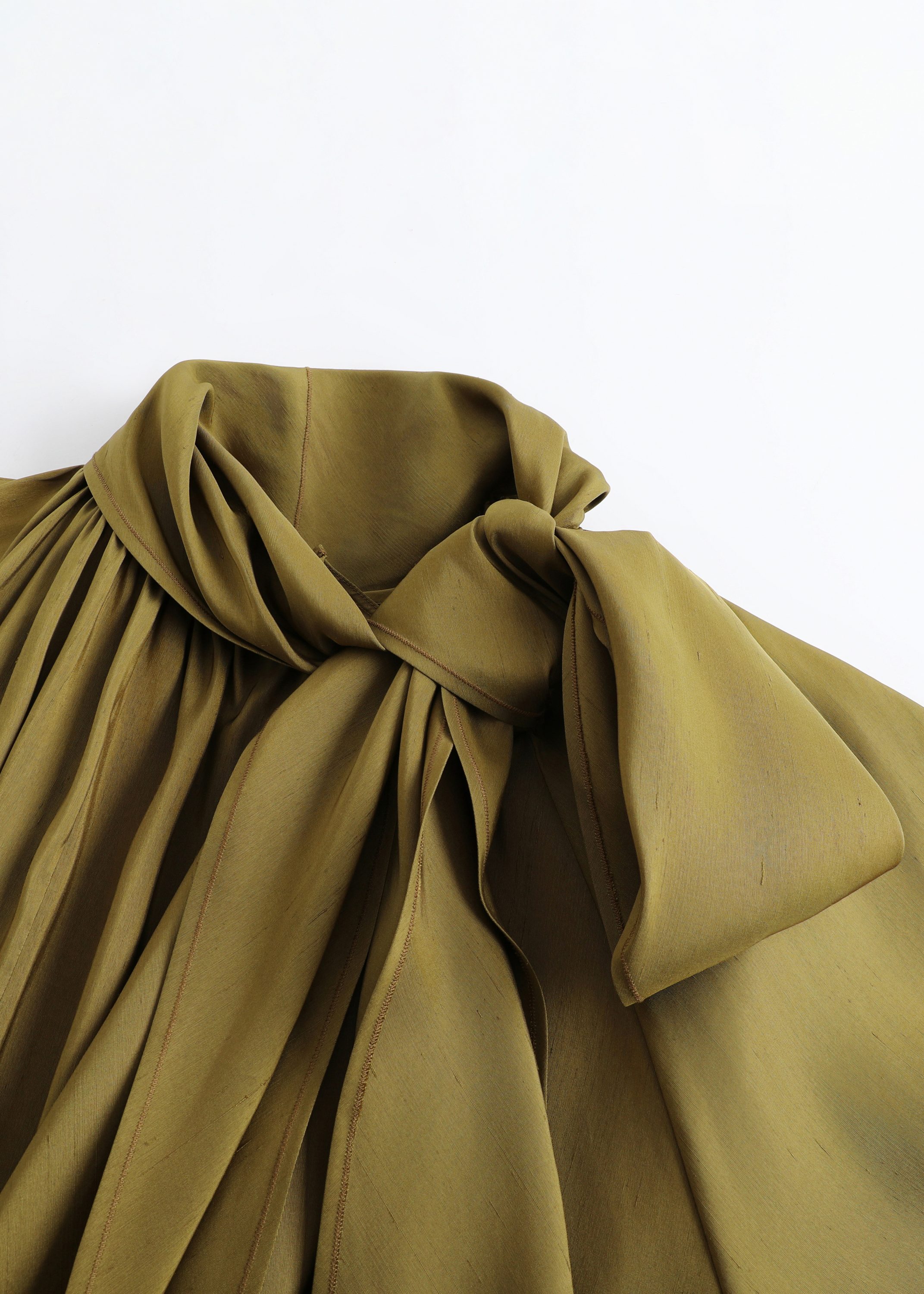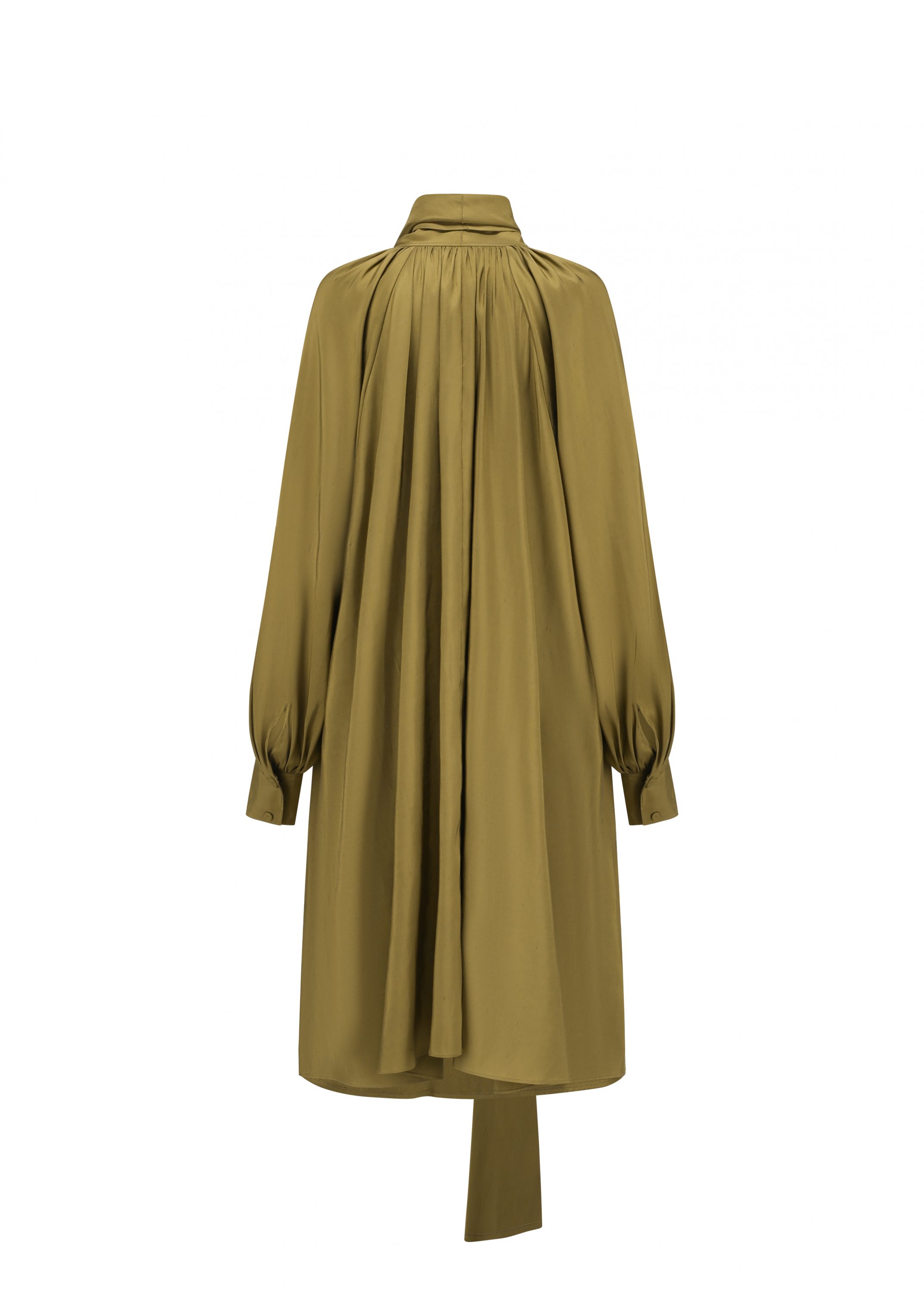 This silk dress falls to the knee with a naturally fluid drape. A flowing over-sized ribbon embellish the neckline, infusing the silhouette with effortless elegance and a touch of romance.