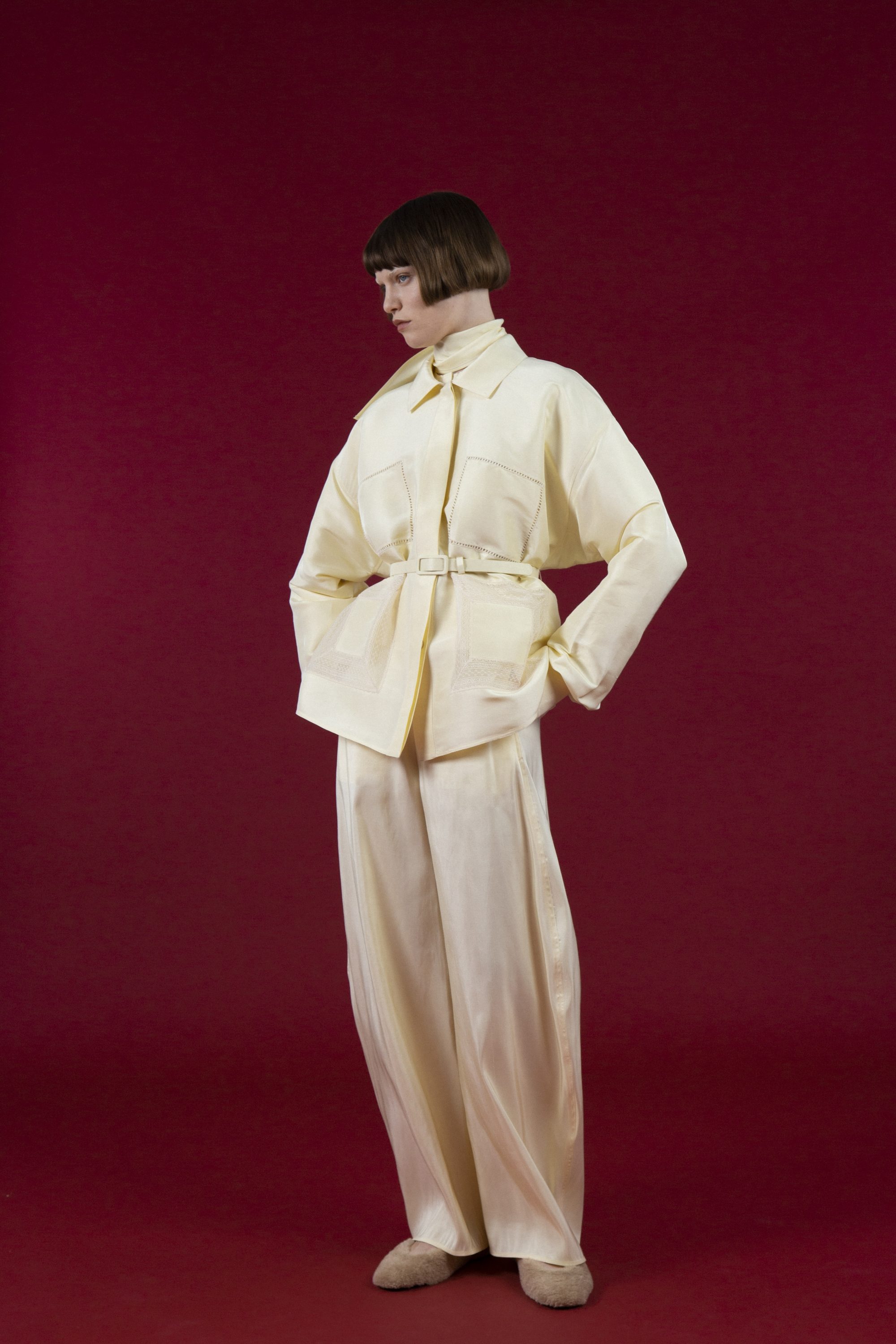 These pants are distinguished by a unique curve-shaped cut, crafted from silk. The relaxed, wide-leg silhouette offers effortless versatility, making them a timeless expression of elegance.