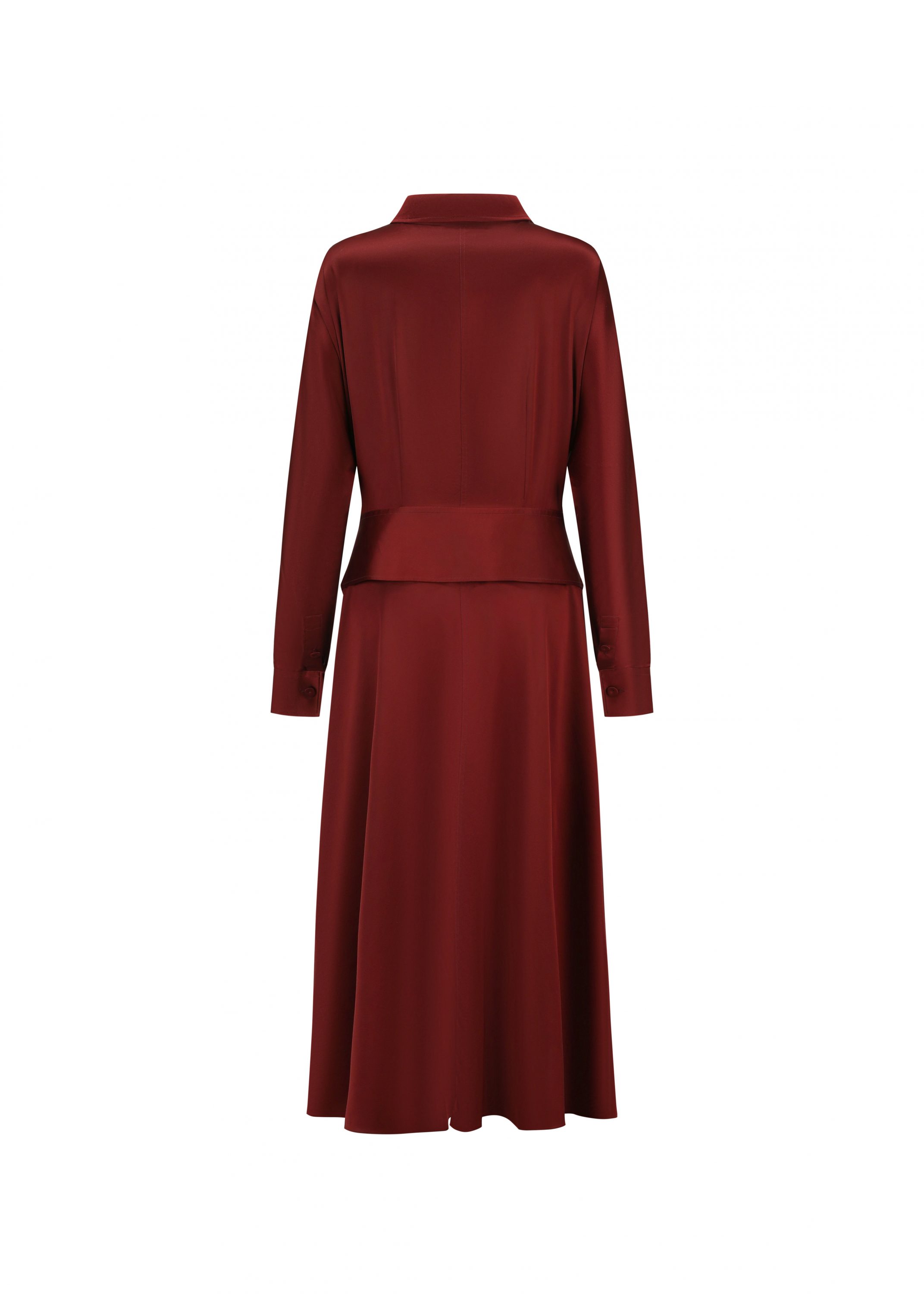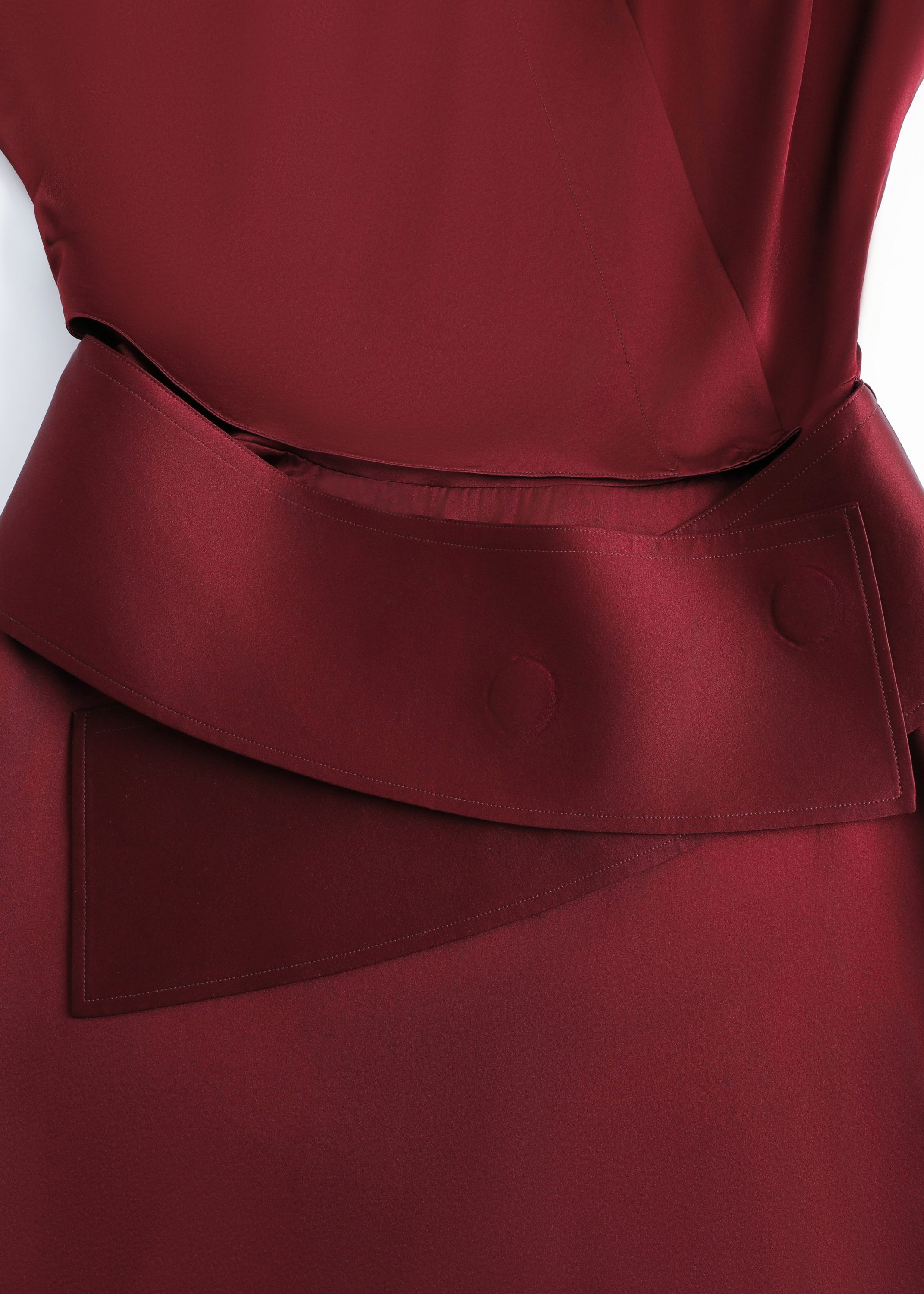This satin dress is defined by an asymmetric magnetic-buckle belt that is artfully draped on the waist. Relaxed yet elegant.