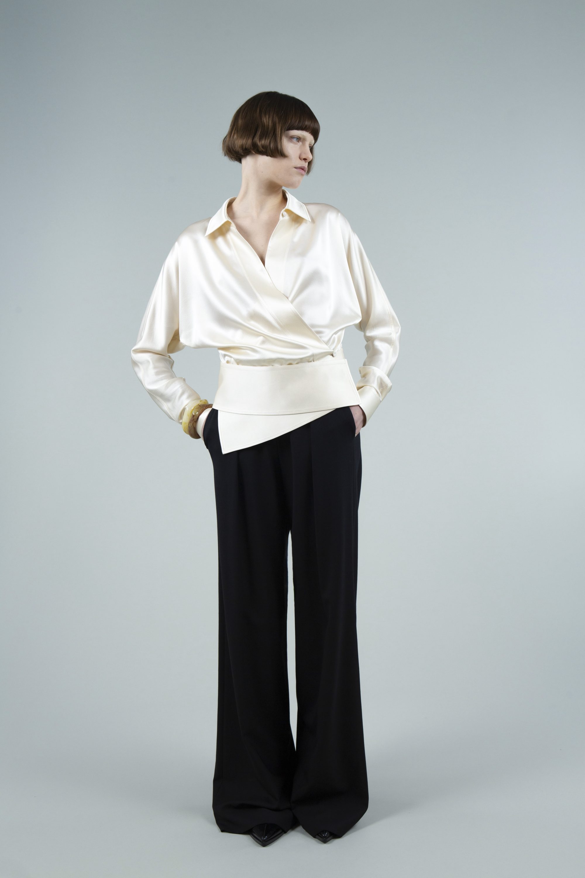 Silk satin shirt defined by an asymmetric magnetic-buckle belt and a curved front opening.