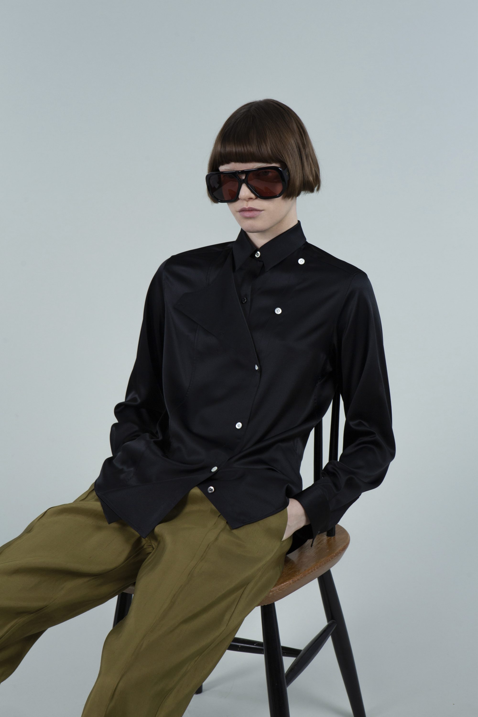 Refined silk-blend shirt featuring a distinctive double-breasted design and a unique front opening that originates at the shoulder.