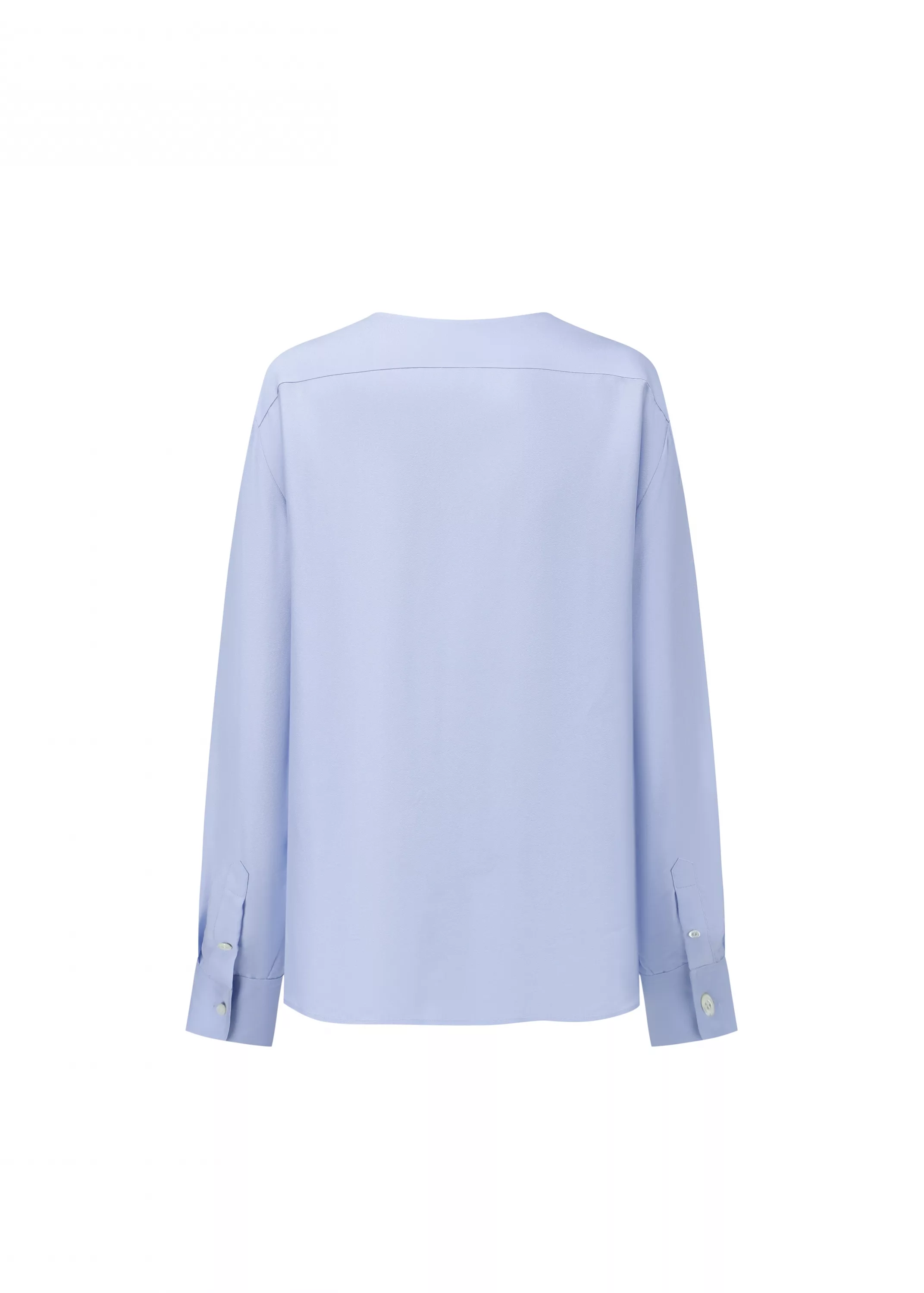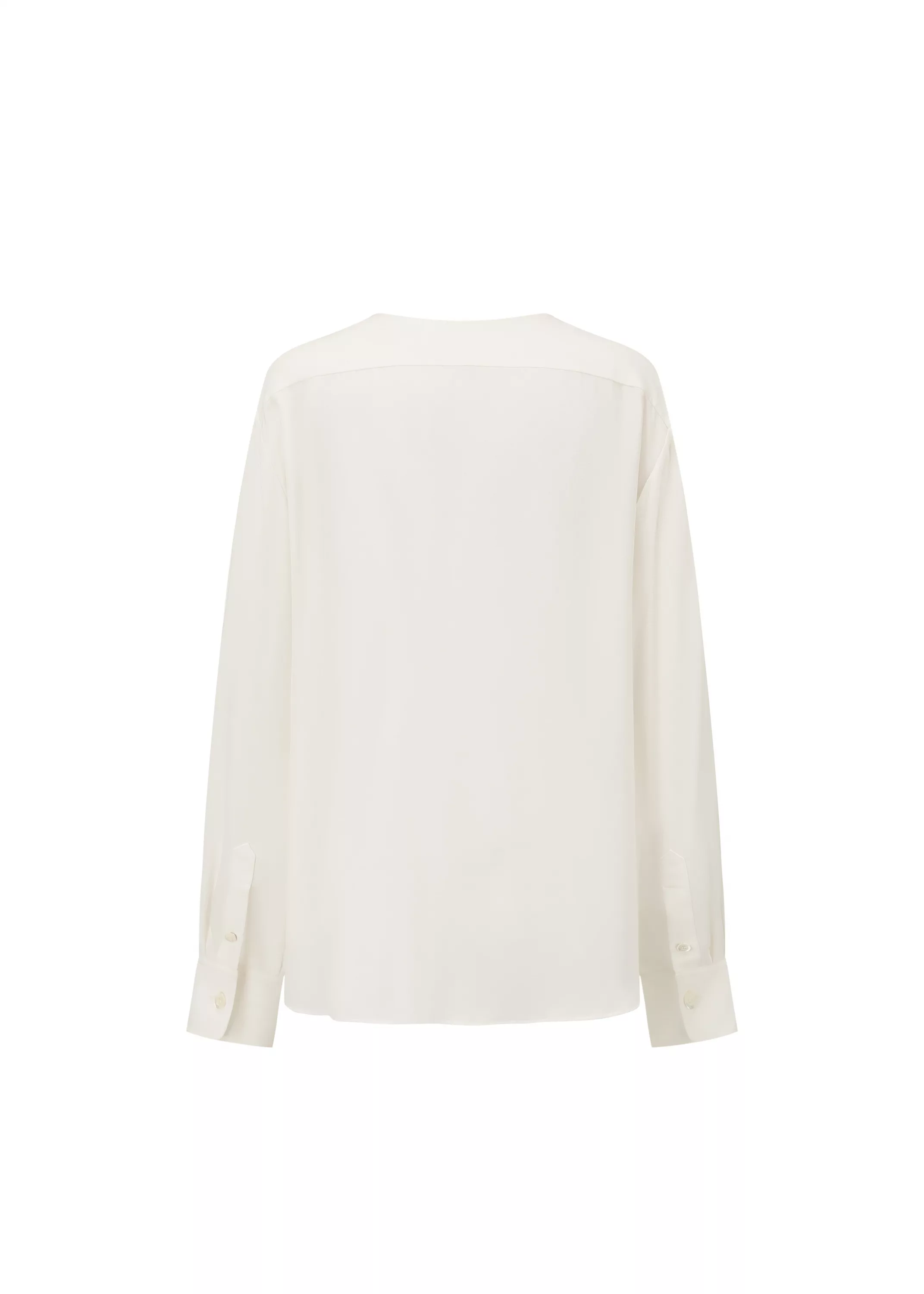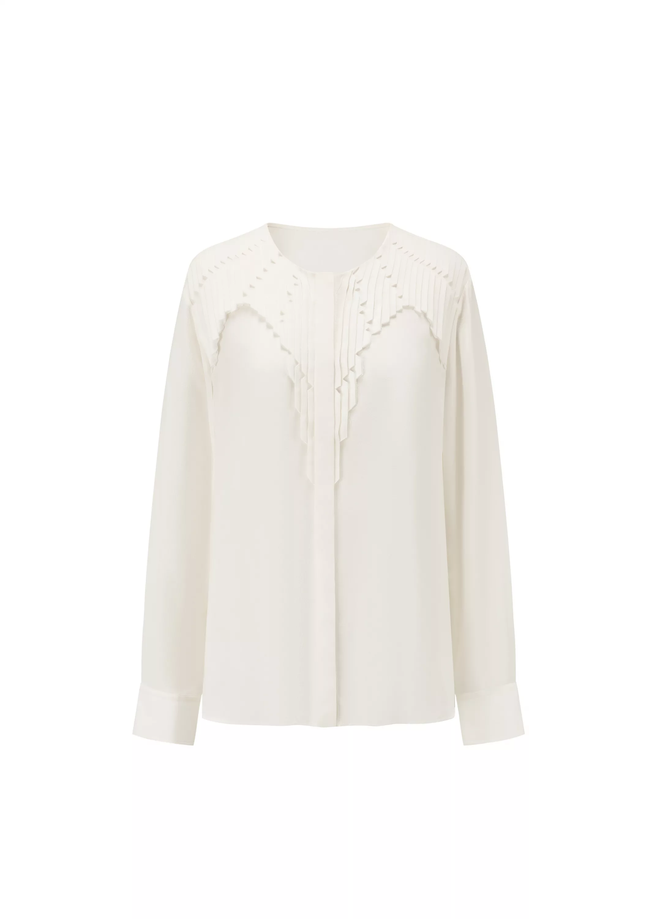 A refined long-sleeve blouse with delicate pleated accents. Designed with a fluid silhouette and subtle button detailing,