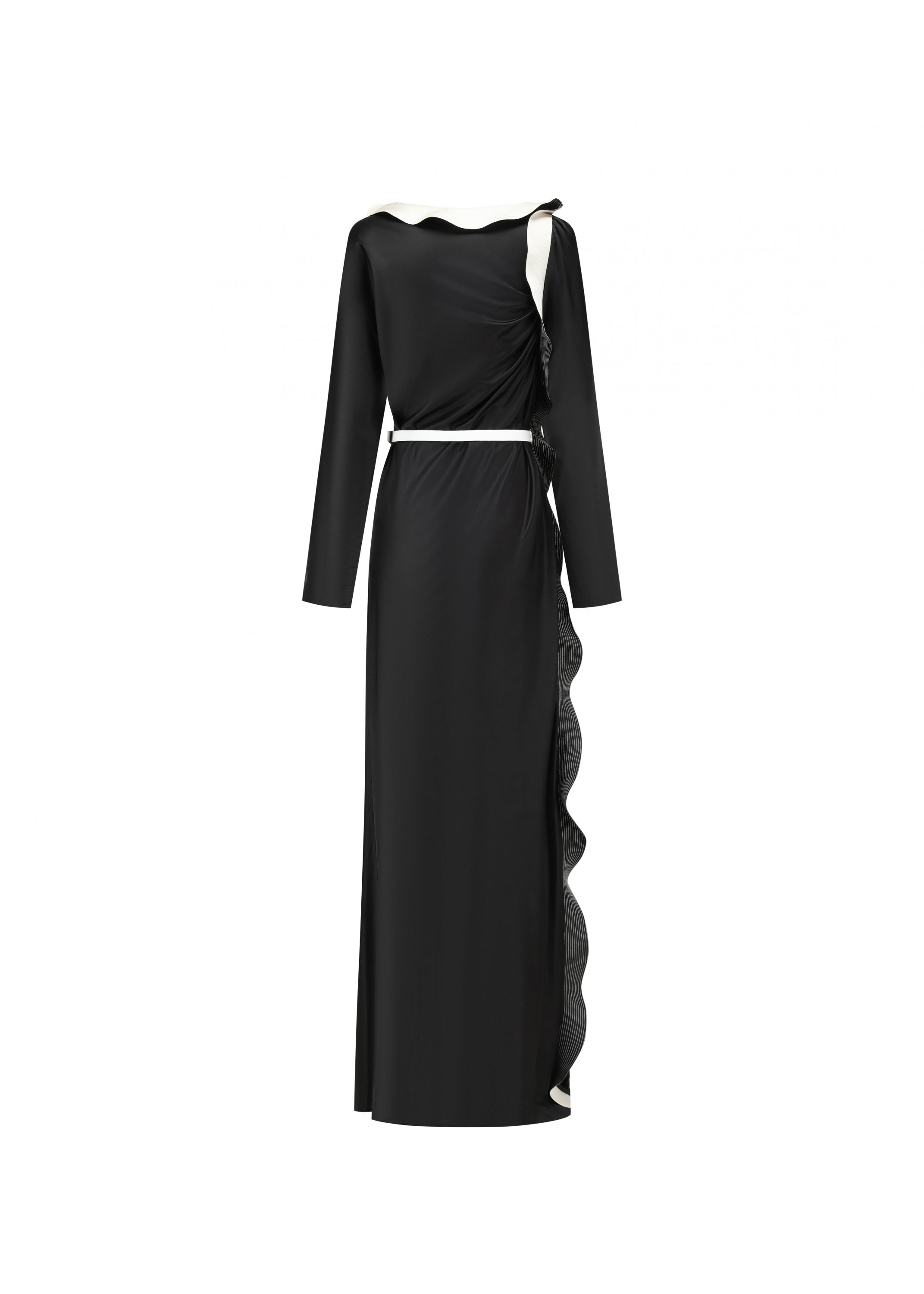 This dress is embellished with asymmetrical ruffles along the neckline and on one side the fabric gathers to create a sculptural effect. Playful color-contrast lends modern sophistication, while a belt cinches the waist to shape an elegant body silhouette.