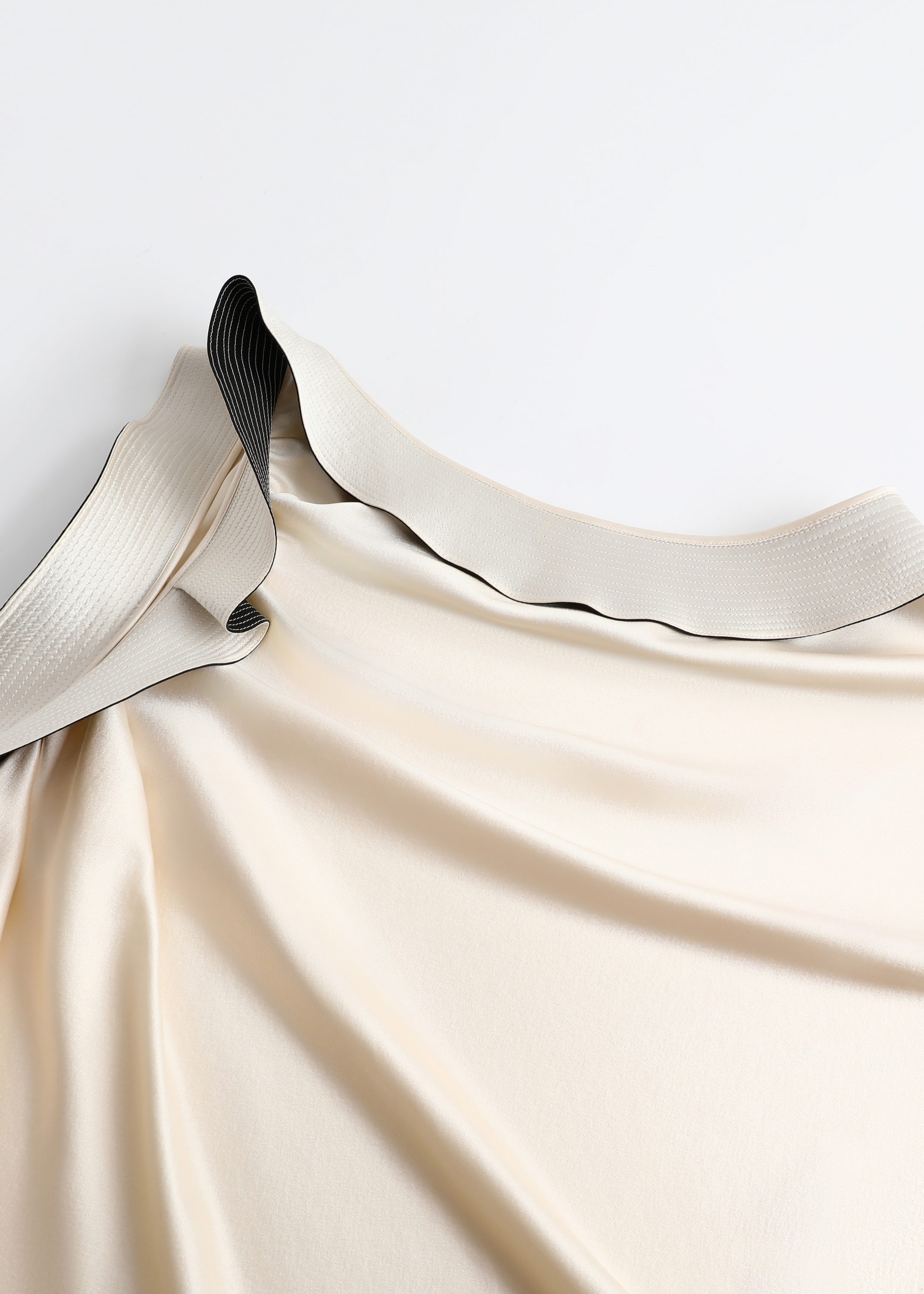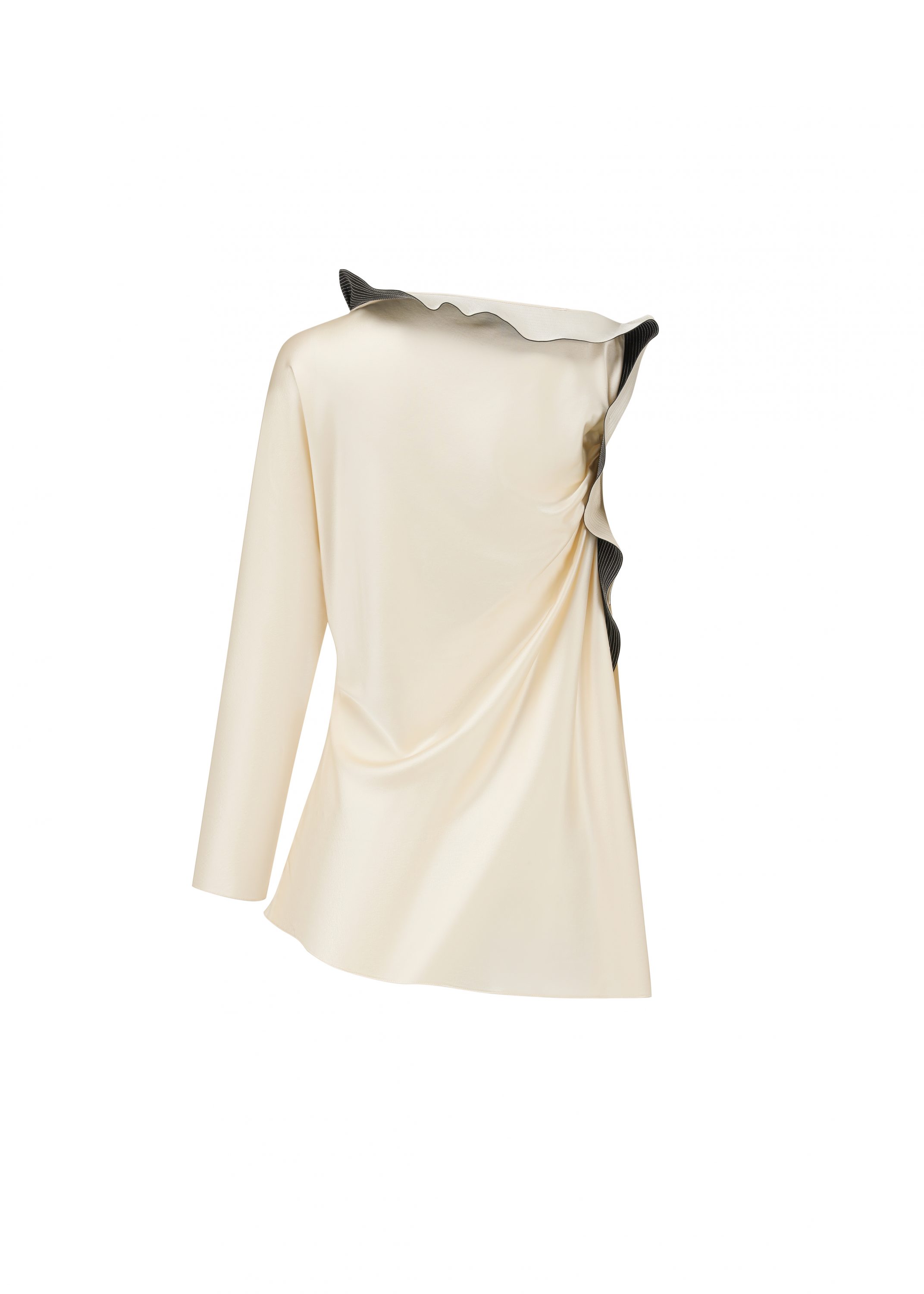 The interplay of beige and black of this top lends timeless and classic allure. This elegant top is accented with asymmetrical ruffles along the neckline and one side. Fabric gathers at the waist to sculpt a three-dimensional silhouette.