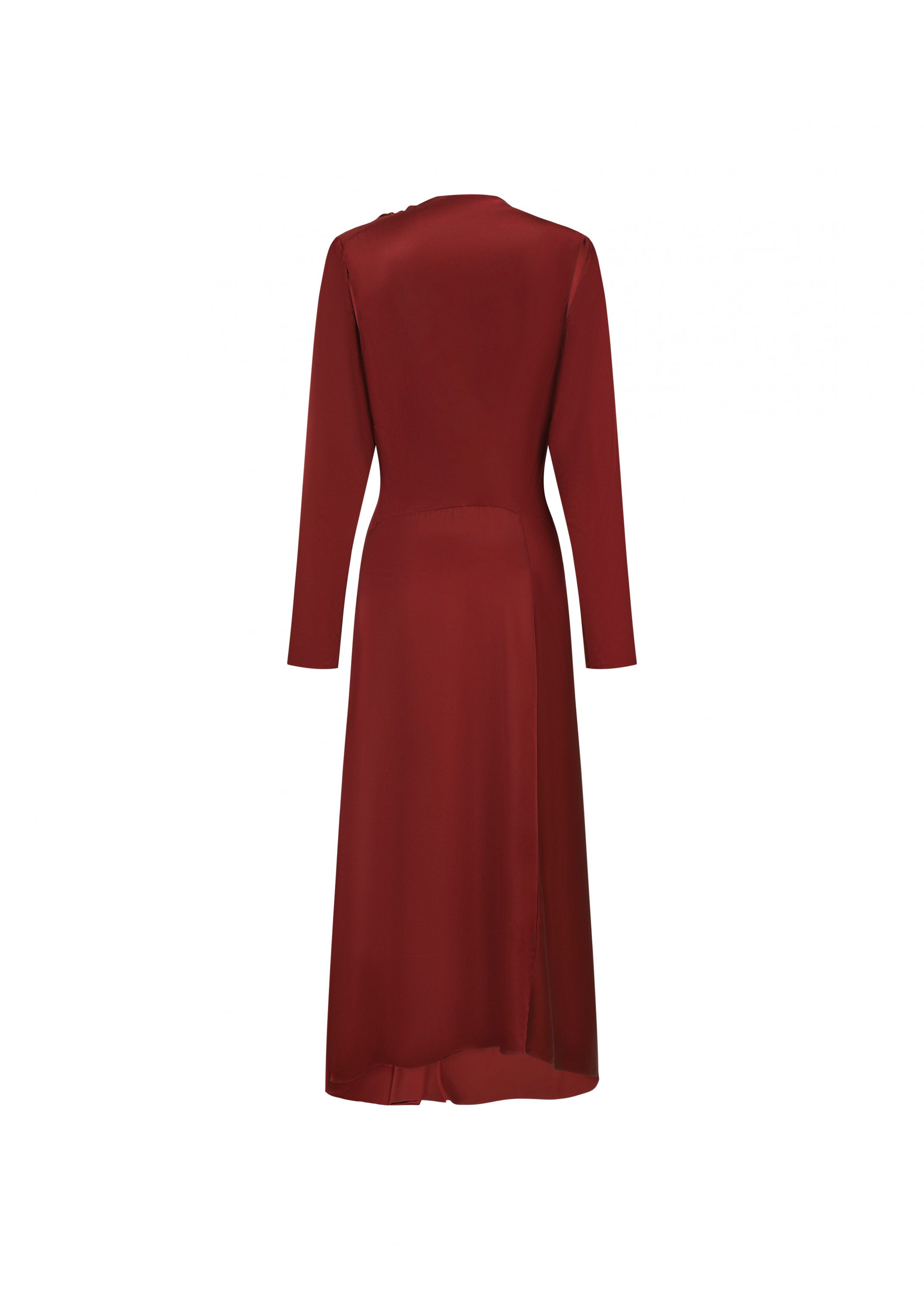 This dress features a fluid draped neckline, with fabric gathered at shoulder and waist only at one side. A cut-out at the back shows more skin, as well as a subtle elegance.