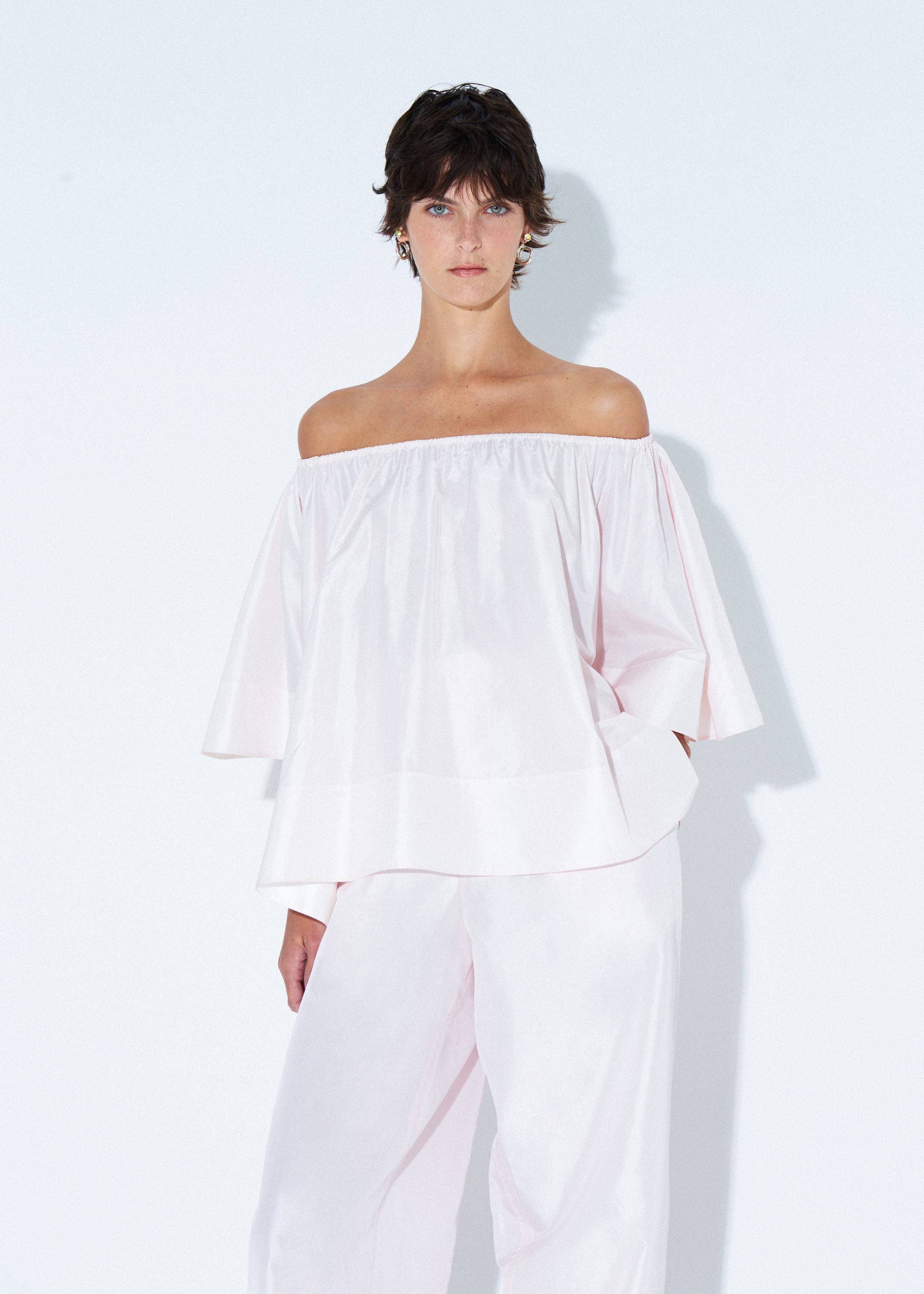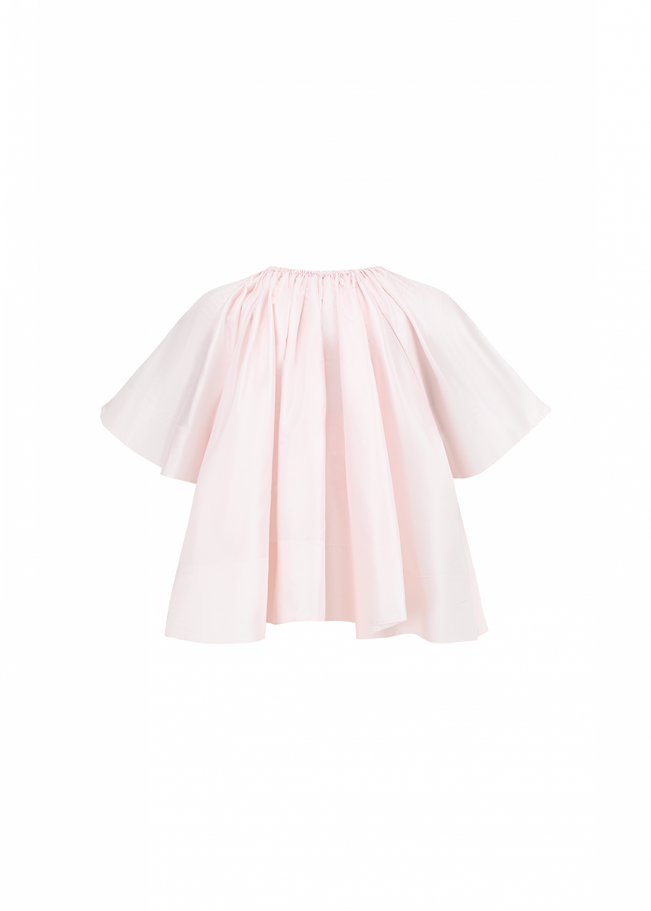 Silk taffeta top with an elasticized collar, sheer fabric, and a draped T-shirt silhouette for effortless elegance.